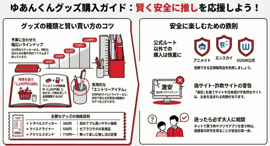 でも、一番大切なことを最後にもう一度だけ言わせてください。グッズをたくさん持っているからエラい、持ってないからファンじゃない、なんてことは絶対にありません。440円の下敷きを1枚買って毎日大切に使うのも、1万円のぬいぐるみセットを買うのも、ゆあんくんを応援する気持ちの強さは同じです。自分のお小遣い(お財布の事情)の範囲内で、おうちの人と相談しながら、無理なく計画的に楽しむことが、推し活を長く楽しむための最大の秘訣です。